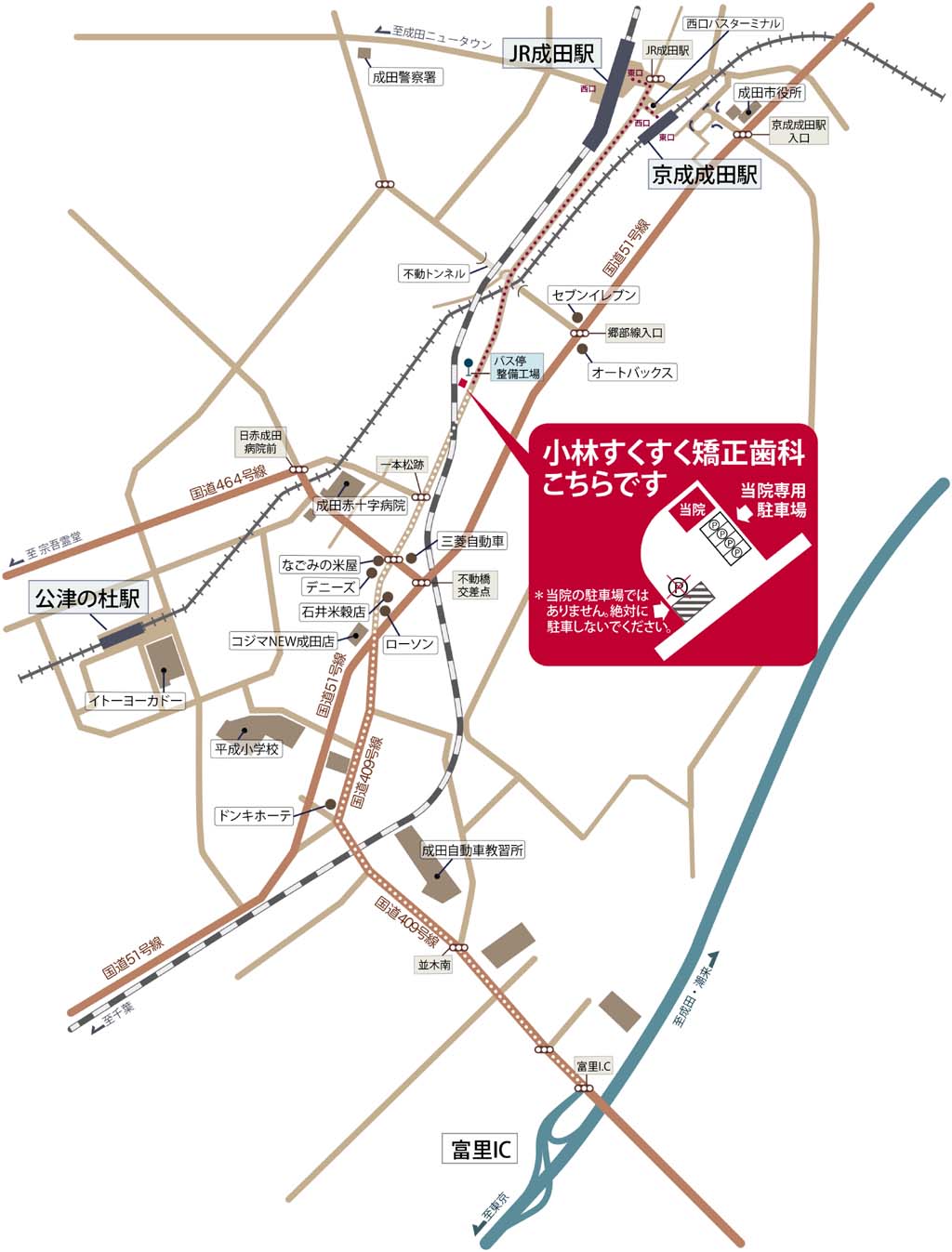 ・京成成田駅 参道口(西口)より、千葉交通バスがご利用出来ます。当院最寄りのバス停「整備工場」まで4分ほどです。降車後、バス進行方向に徒歩1分ほどで当院の看板が見えます。